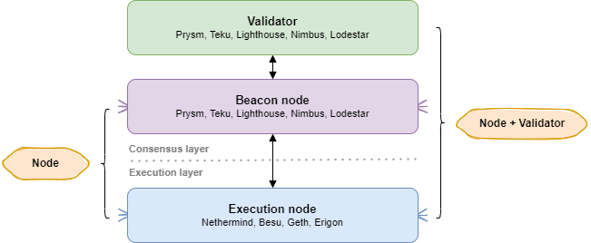 Every Ethereum node contains software for both layers: execution-layer client software (like Nethermind, Besu, Geth, and Erigon), and consensus-layer client software (like Prysm, Teku, Lighthouse, Nimbus, and Lodestar).